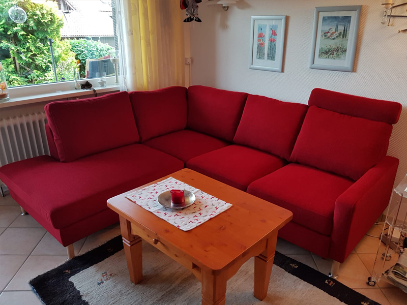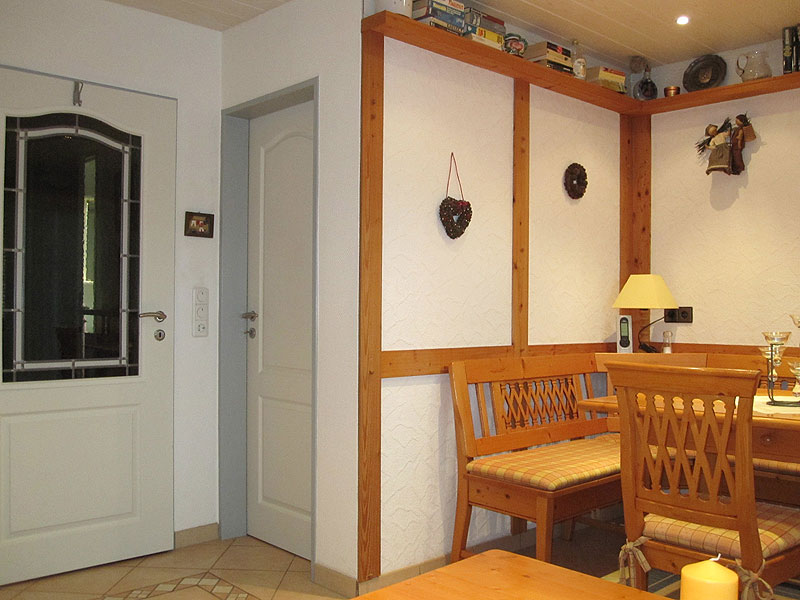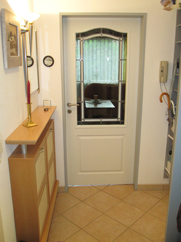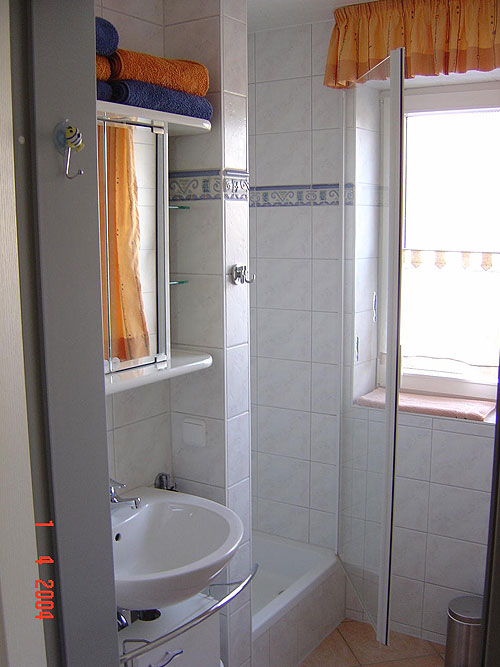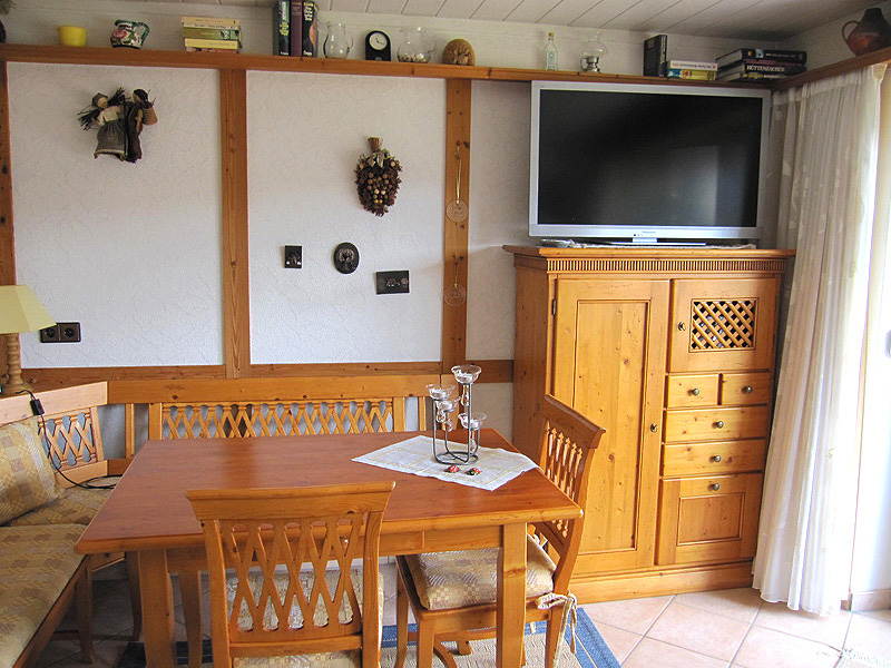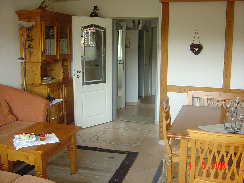 Das Wohnzimmer ist mit Sitzecke und Essecke ausgestattet. Ein großer LCD-Flachbild-FS, eine kleine Stereoanlage und ein Telefonanschluss sind vorhanden, ein zusätzlicher Fernseher m. DVD befindet sich im Schlafzimmer. Auch Bücher und Spiele liegen in unserer Wohnung aus. Das Schlafzimmer hat Betten von 1,80 x 2,00 m (kein hohes Fußteil), das Bad ist mit Dusche, WC und Waschbecken eingerichtet und modern hell gekachelt.