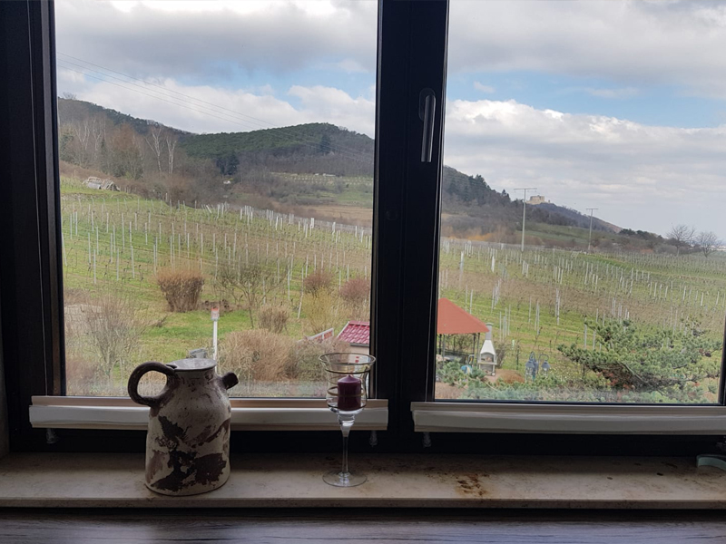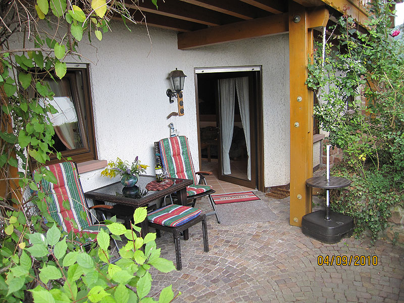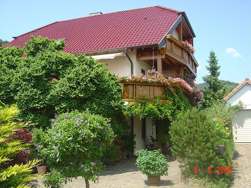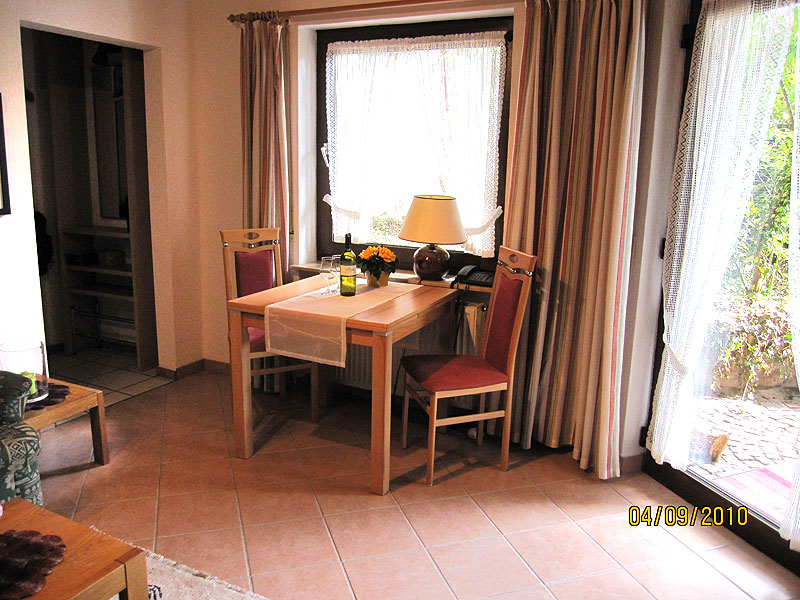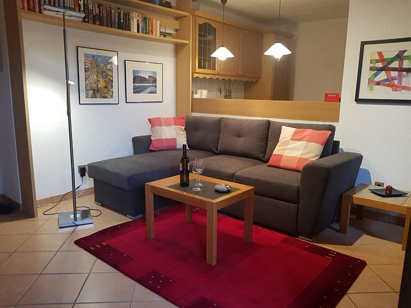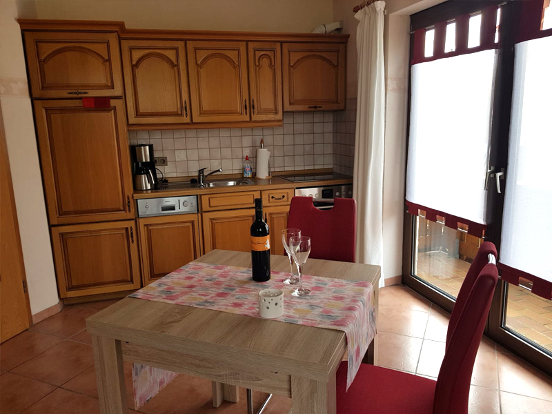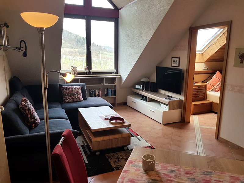 Diese Wohnung ist etwa 60 qm groß und bietet einen schönen Ausblick auf das Hambacher Schloss, das Rebenmeer und die Rheinebene. Das Wohnzimmer ist mit Sitzecke, Essecke und Küchenzeile eingerichtet, es hat einen Balkon zur Süd-/Westseite.