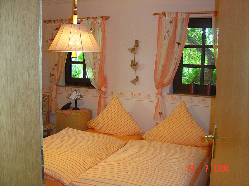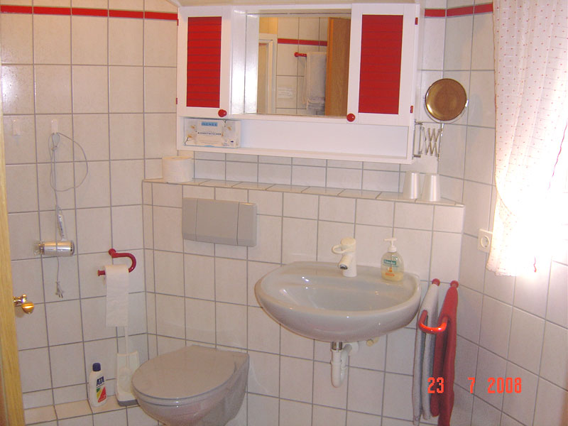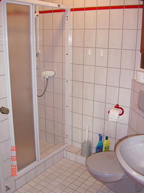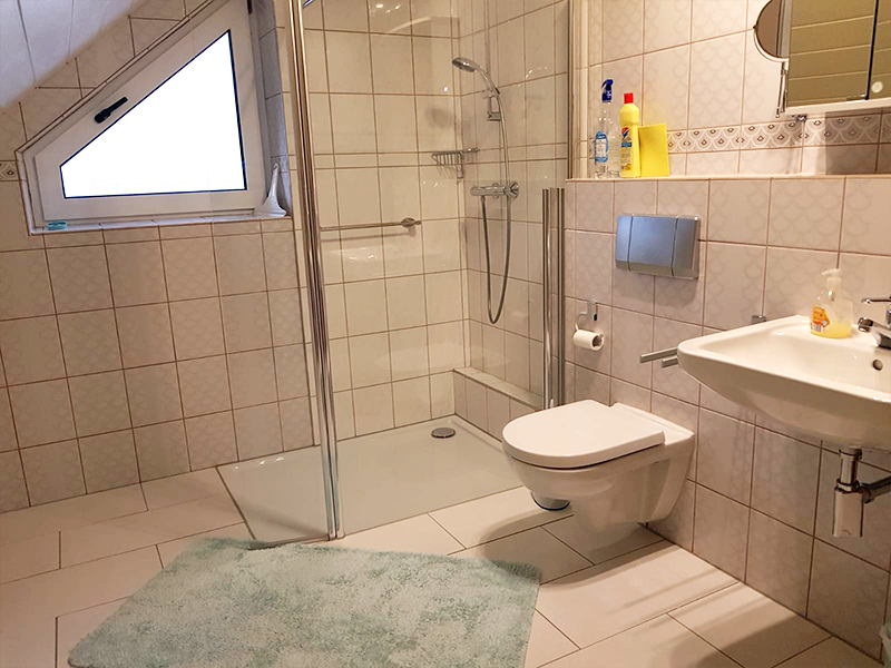 Das Schlafzimmer hat Betten 1,80 x 2,00 m ohne hohes Fußteil. Das Bad ist mit begehbarer Dusche, WC und Waschbecken ausgestattet und hat ein Fenster.