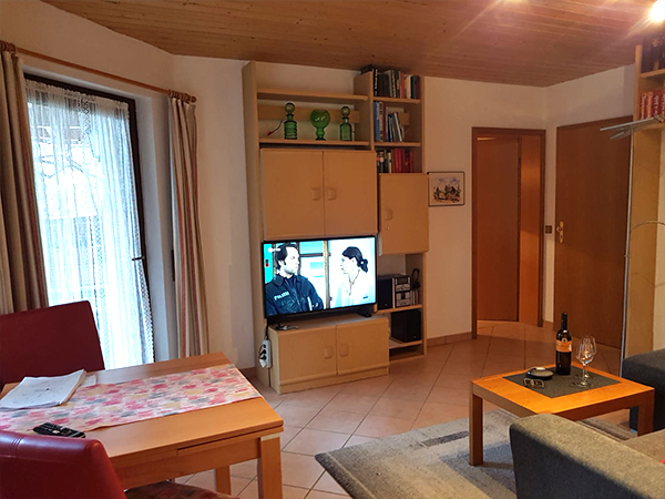 Im Wohnzimmer befinden sich ein großer Flachbild-FS, ein Radio sowie ein Telefonanschluss.